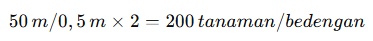 Setelah tahu jumlah bedengan, selanjutnya hitung berapa banyak tanaman yang bisa ditanam di setiap bedengan. Caranya, panjang bedengan dibagi jarak tanam, lalu dikalikan 2 (karena sistem yang dipakai adalah double rows).